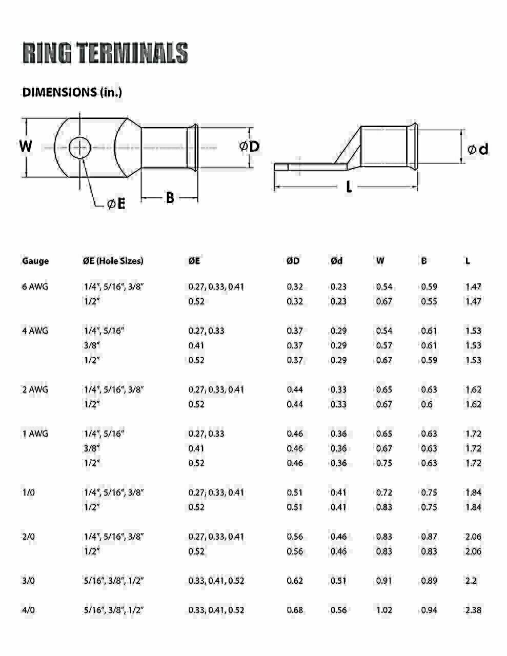 • Choose from a variety of wire sizes from 6 AWG to 4/0 AWG and stud sizes from ¼” to ½” that fits your application; Can be crimped (best method) or soldered. Works on solid or stranded wire. NOTE: Audio wire may not be direct fit. Recommend to use a size or two larger terminal than the gauge of the audio wire.