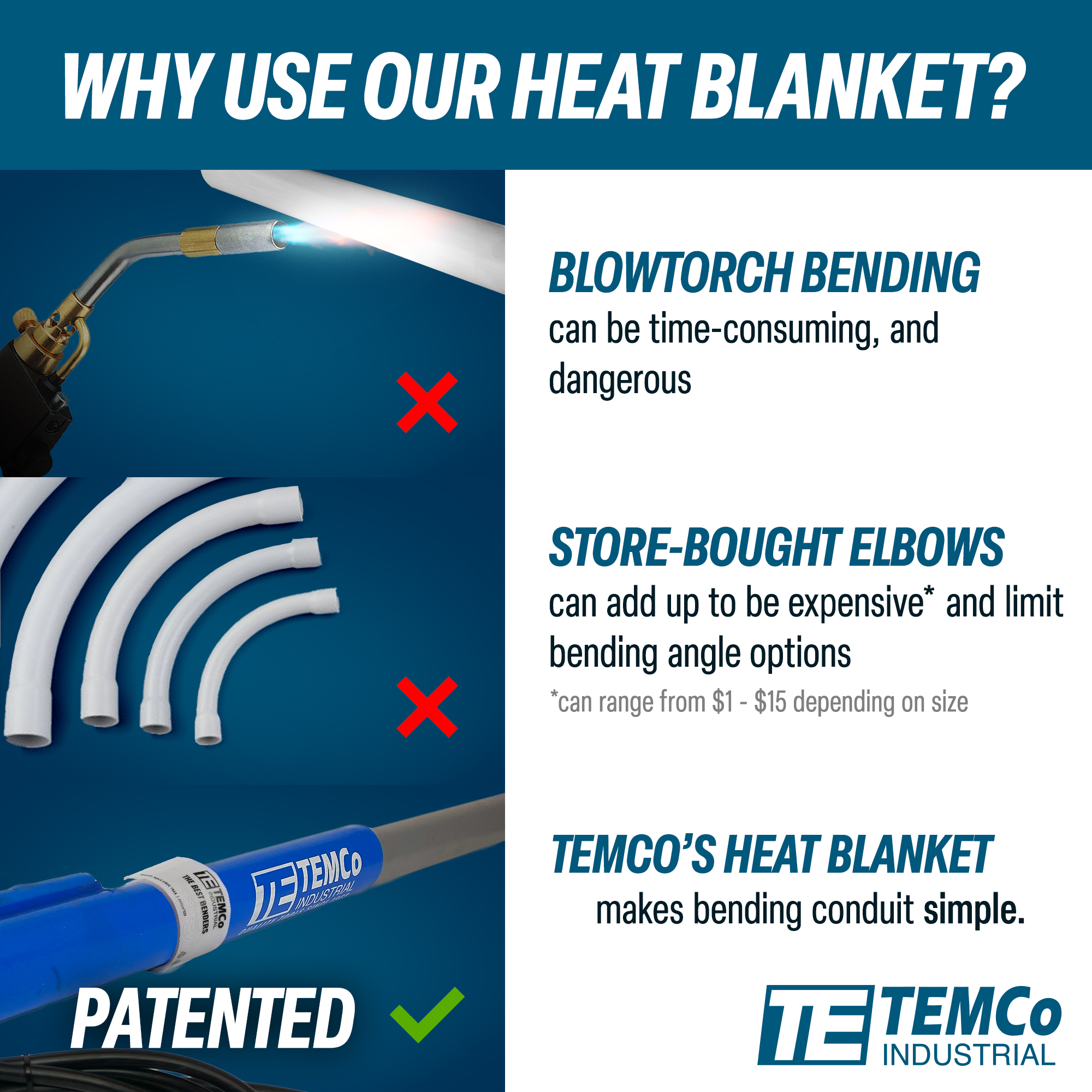 - TEMCo's longer heat blanket design can make wider bends than the competitors! (TEMCo’s blanket makes it easier to pull wire!)